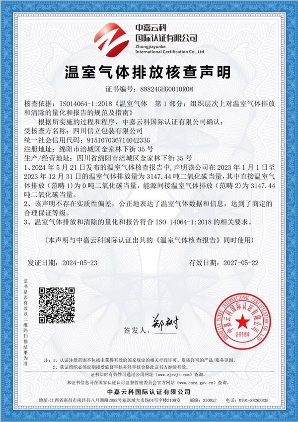 ? ? ? ?根據(jù)企業(yè)發(fā)展需要,現(xiàn)對(duì)CFP:紙質(zhì)包裝箱、包裝盒的生命周期的產(chǎn)品碳足跡;GHG:組織邊界范圍內(nèi)【四川省綿陽(yáng)市涪城區(qū)金家林下街35號(hào)的四川信立包裝有限公司】所涉及的溫室氣體碳排放管理相關(guān)活動(dòng)等相關(guān)認(rèn)證核查予以公示,接受社會(huì)監(jiān)督。